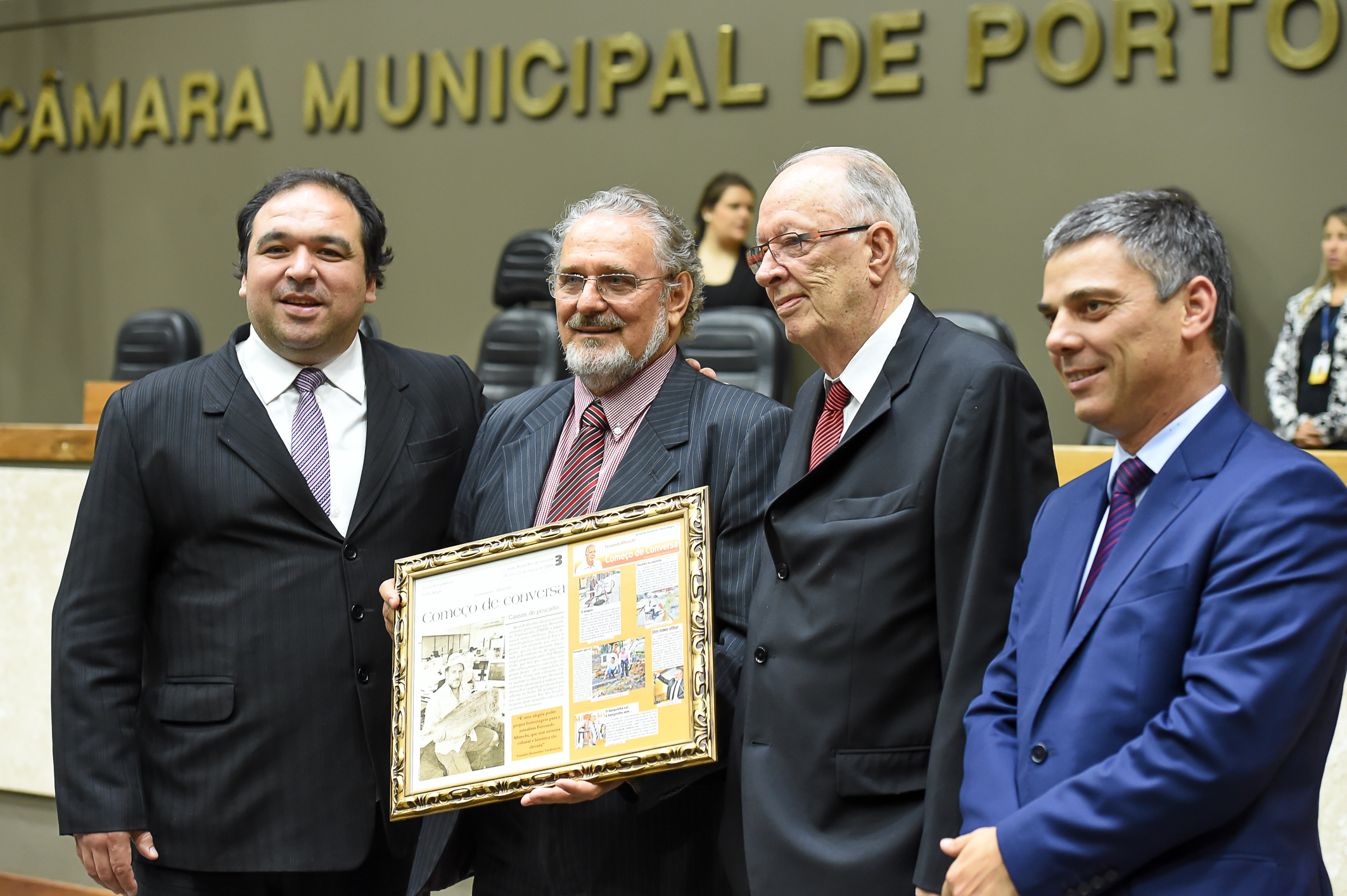 Outorga do Título de Cidadão de Porto Alegre ao senhor Dietmar Fernando Albretch. Na foto: Vereador Dr. Thaigo Duarte, proponente da homenagem, vereador Bernardino Vendrusculo, o homenageado, Dietmar Fernando Albretch e o presidente da CMPA, vereador Cássio Trogildo.
