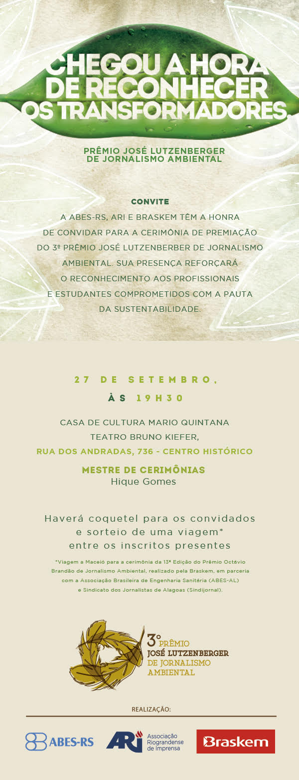Acontece amanhã, dia 27, a cerimônia de premiação da 3ª edição do Prêmio José Lutzenberger de Jornalismo Ambiental.